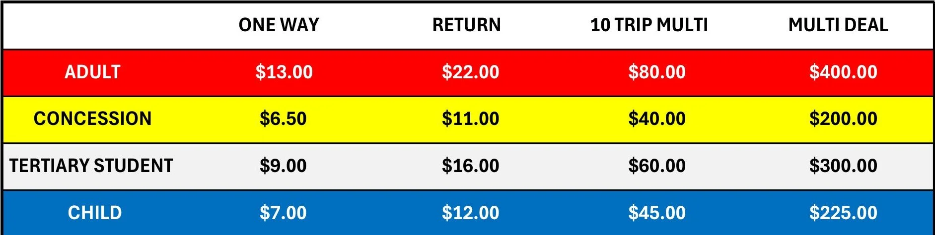Single or return tickets can be purchased. We also offer Multi Ticket Passes that do not expire.